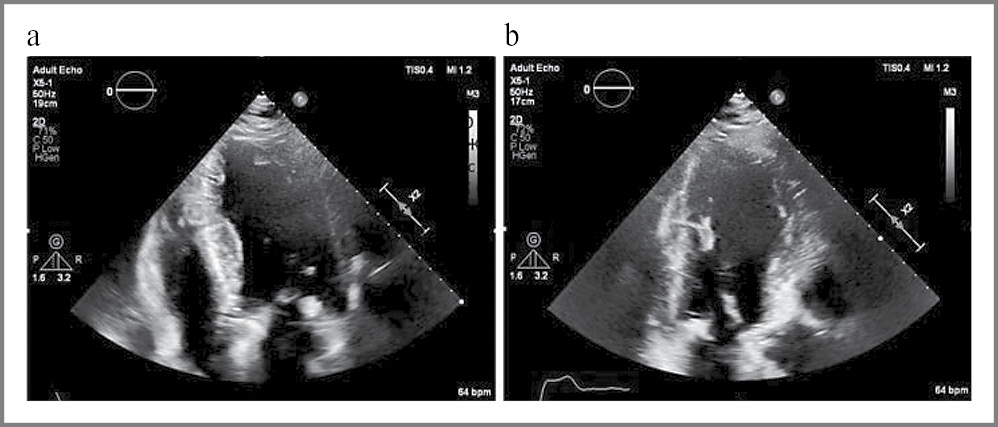 6. Fig. 5. Echocardiography. On the left: the apical four-chamber with pronounced hypertrophy of the LV myocardium. On the right: the apical three-chamber with AV calcification.