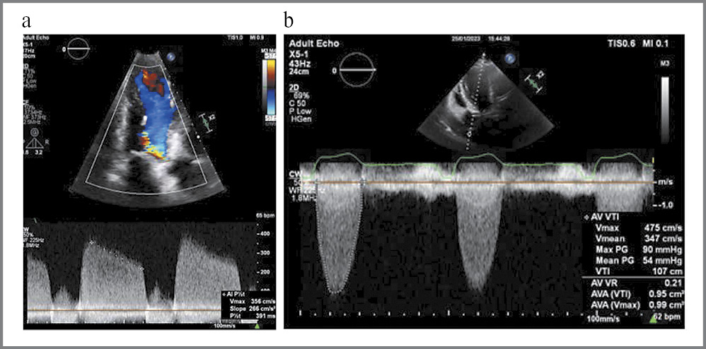 7. Fig. 6. Transthoracic echocardiography. On the left: the half-life of the diastolic gradient on the AV; on the right: the indicators of aortic valve stenosis.