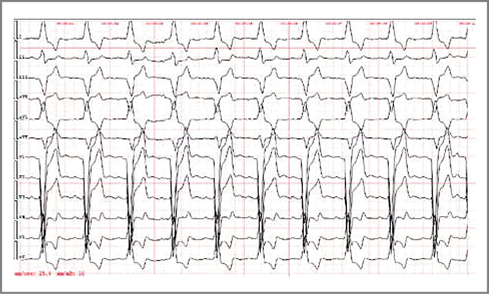 4. Fig. 3. ECG of patient L. in 2017. Recording speed – 50 mm/s, voltage – 10 mm/mV. Sinus rhythm with heart rate of 53 beats per minute, 1st degree AV block, QRS duration 120 ms.
