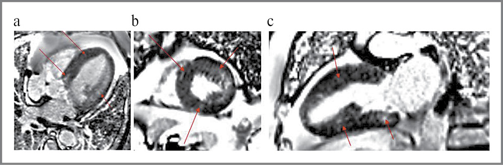 9. Fig. 8. Contrast-enhanced cardiac MRI, arrows indicate areas of intramyocardial fibrosis.