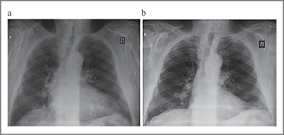 11. Fig. 10. Chest X-ray. On the left: before the surgery; on the right: a week after the surgery. A decrease in the size of the heart and no pulmonary hemodynamics disorders were observed.