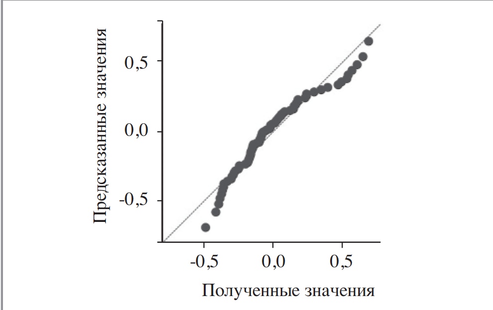 На рис. 2 представлен КК-график оценки нормальности распределения значений модели множественной линейной регрессии. Полученный результат свидетельствует о нормальном распределении данных, что крайне важно для верного построения модели.