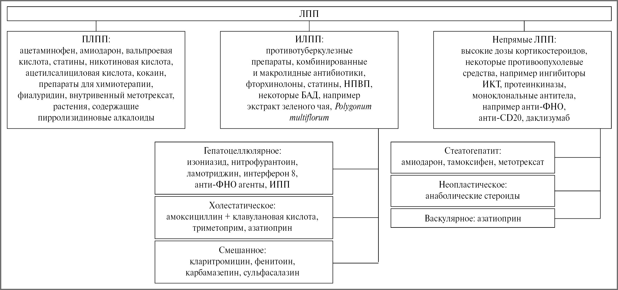Рис. 1. Классификация ЛПП с наиболее характерными гепатотоксичными препаратами.