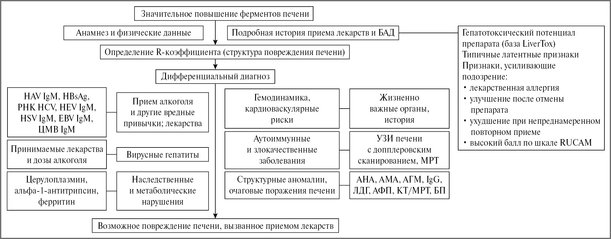Примечание. R=[АЛТ/(ВГН АЛТ):ЩФ/(ВГН ЩФ)]; HAV – вирус гепатита А; Ig – иммуноглобулин G, М; HBsAg – поверхностный антиген гепатита В; HCV – вирус гепатита С; HEV – вирус гепатита Е; HSV – вирус простого герпеса; EBV – вирус Эпштейна–Барр, ЦМВ – цитомегаловирус, МРТ – магнитно-резонансная томография; АНА – антинуклеарные антитела; АМА – антимитохондриальные антитела; АГМ – антитела к гладкой мускулатуре; ЛДГ – лактатдегидрогеназа, АФП – альфа-фетопротеин; КТ – компьютерная томография.