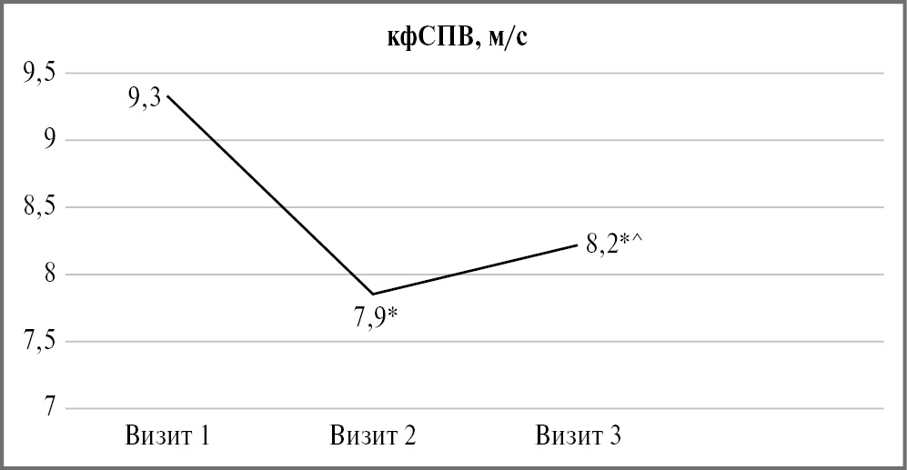 Сравнительная оценка кфСПВ показала значимое снижение (7,9±1,6 м/с) на 2-м визите при сравнении с визитом включения (9,3±1,4 м/с) и с 3-м визитом (8,2±1,6 м/с). Результаты, полученные на 3-м визите, также значимо ниже по сравнению со значениями при включении, но больше, чем на 2-м визите (рис. 1).