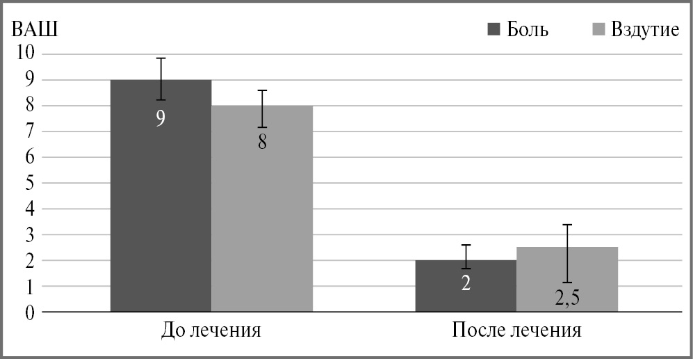 У пациентов в результате 8-недельной терапии дулоксетином купировался болевой синдром до 2 (2; 3) и вздутие живота до 2,5 (1; 3) балла (p<0,05); рис. 1.