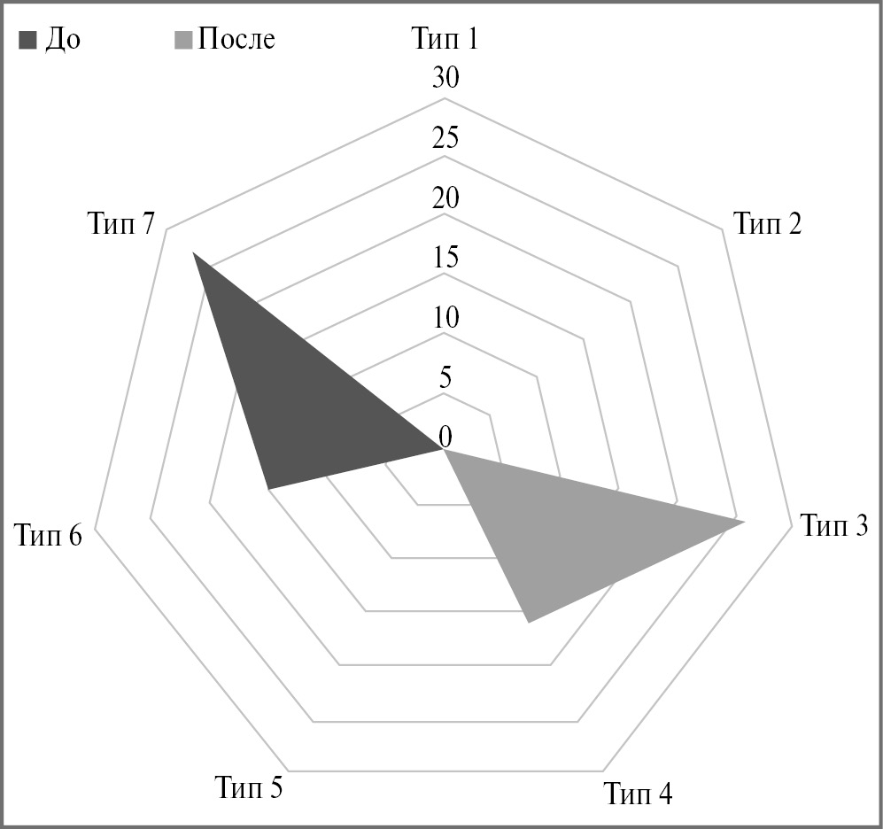 Снизились также показатели шкалы Спилбергера– Ханина: уровень личностной тревоги – с 42,5 (35; 53) до 22 (20; 24); p<0,05 и ситуационной тревоги – с 40 (37; 49) до 22 (21; 36); p<0,05 (рис. 4).