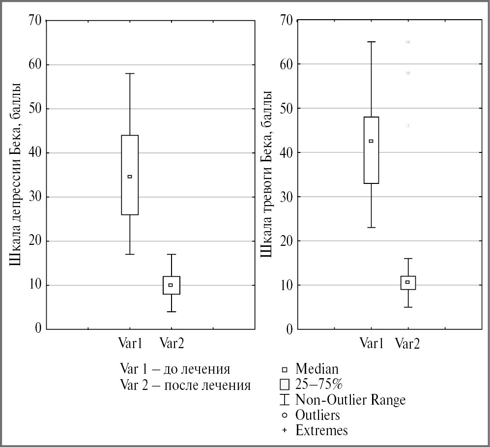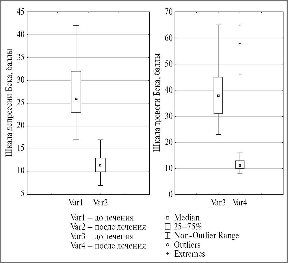 Уровень тревожного синдрома уменьшился с 38 (31; 45) до 11 (10; 12) баллов (p<0,05), и снизился уровень депрессии по шкале Бека с 26 (23; 32) до 11,5 (10; 13) балла (p<0,05); рис. 3.