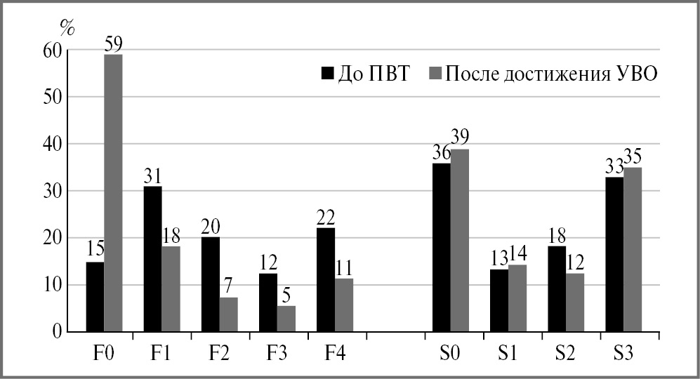 Примечание. При сравнении частоты выявления стадий фиброза печени с F0 по F4 до начала ПВТ и в отдаленном периоде после достижения УВО – p<0,01; при сравнении частоты выявления стеатоза печени с S0 по S3 до начала ПВТ и в отдаленном периоде после достижения УВО – p>0,05.