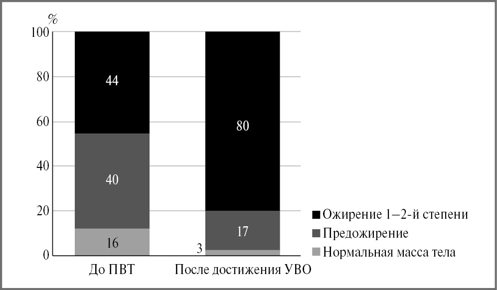 - отсутствие изменений ИМТ, выходящих за пределы диапазона ИМТ, соответствующего категории массы тела, определенной до начала ПВТ, – у 76% (n=210);
