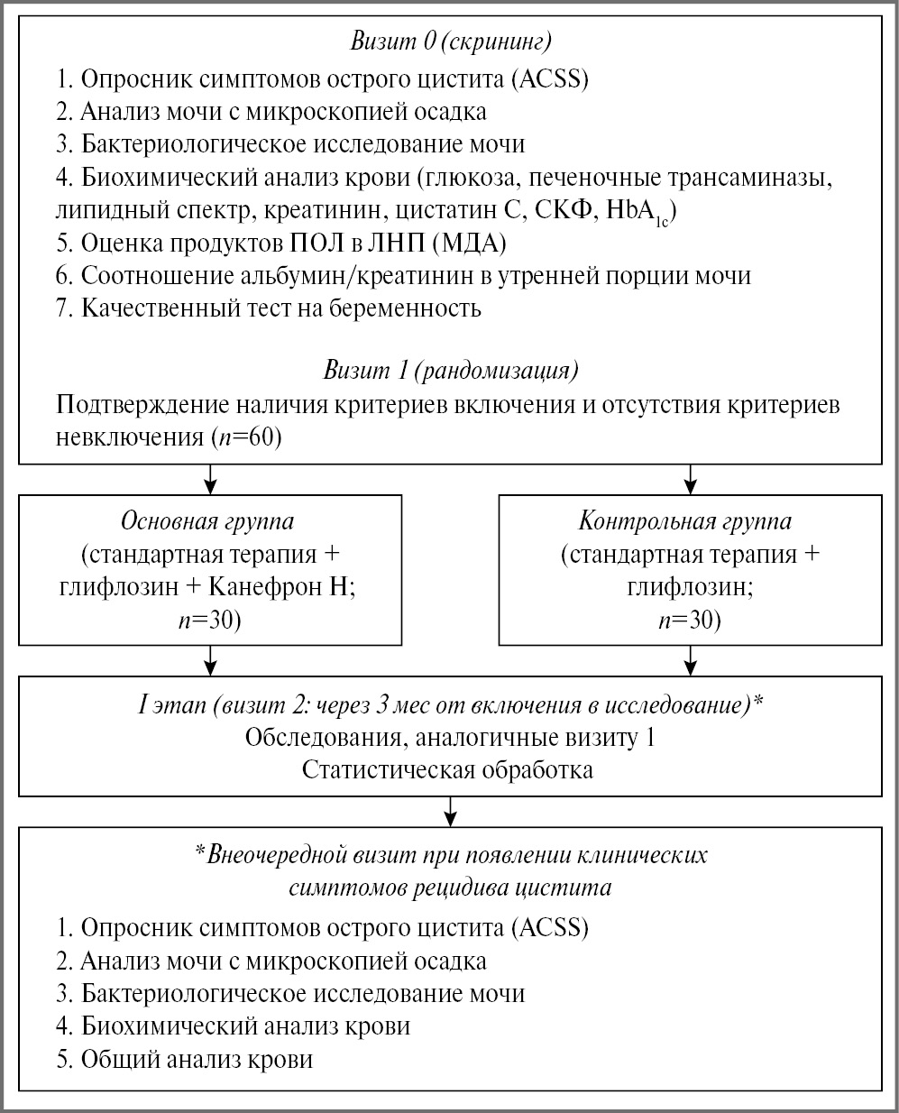 В исследование включены 60 женщин в возрасте 18–75 лет (медиана возраста 66 [60, 5; 72] лет) с СД 2, получавших иНГЛТ-2 и имевших в анамнезе рецидивирующий цистит в фазе ремиссии (рис. 1). Период исследования – 6 мес (I этап: 3 мес терапии препаратом Канефрон® Н и II этап: 3 мес последующего наблюдения). Проведена простая рандомизация «конвертным» методом, пациенткам основной группы (n=30) дополнительно к стандартной терапии СД 2, включавшей глифлозин, назначен препарат Канефрон® Н по 2 таблетки 3 раза в день на 3 мес, пациенткам в контрольной группе (n=30) – только стандартная терапия СД 2, включавшая глифлозин. В статье представлены результаты I этапа исследования (терапия препаратом Канефрон® Н непрерывно в течение 3 мес).