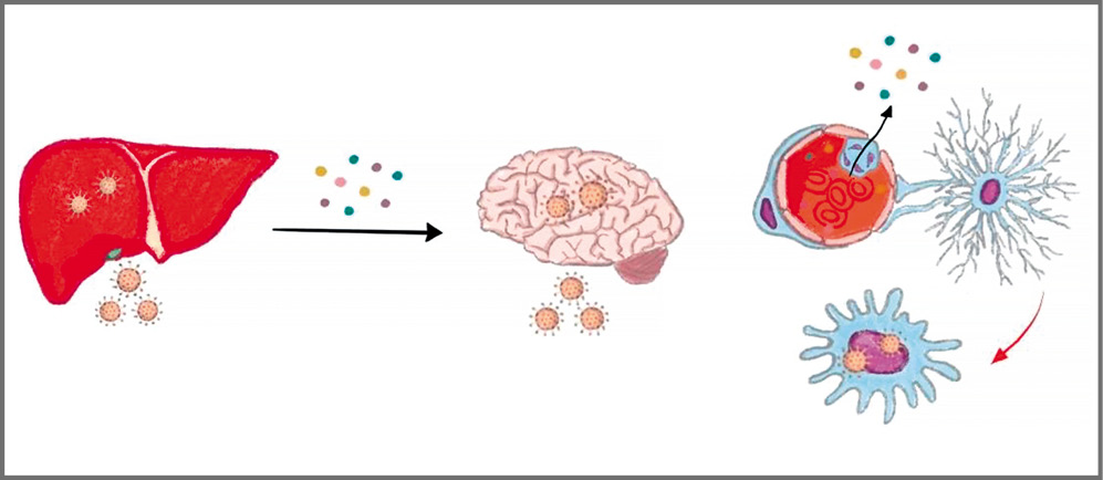 Fig. 1. Possible relationship between liver injury and astrocyte injury in COVID-19. Colored circles represent NH3, inflammatory mediators, and acute phase proteins; the red arrow indicates the activation of astrocytes driven by these substances.