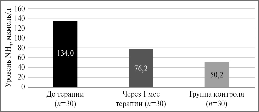 Материалы и методы. В исследование вошли 30 студентов от 18 до 24 лет, переболевших COVID-19 и имеющих жалобы на снижение внимания, ухудшение памяти и другие когнитивные расстройства, присущие печеночной энцефалопатии латентной (0-й класс) или легкой (1-й класс) степени, без выраженных нарушений интеллекта, памяти, речи и способности к обучению. У молодых людей зарегистрированы гипераммониемия, повышенные уровни аланинаминотрансферазы, аспартатаминотрансферазы и ã-глутамилтранспептидазы, признаки печеночной энцефалопатии согласно результатам психометрических тестов. С целью коррекции уровня аммиака крови, признаков печеночной энцефалопатии и улучшения общего состояния всем пациентам в рамках исследования проводили терапию препаратом L-орнитин-L-аспартат.