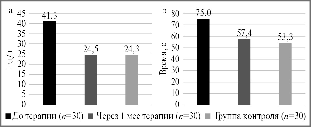 В исследовании принимали участие 60 студентов (30 – опытная группа, 30 – контроль) от 18 до 24 лет, которые переболели коронавирусной инфекцией легкой или средней степени тяжести и на момент исследования имели симптомы ПКС: жалобы на когнитивную дисфункцию, астенические проявления. Критерии включения: подтвержденная коронавирусная инфекция в анамнезе. Критерии исключения: клинические проявления ПКС без положительного теста полимеразной цепной реакции на COVID-19 в анамнезе или выписке из амбулаторной карты (истории болезни), хронические инфекционные заболевания, которые могли бы повлиять на результат. В процентном соотношении число женщин составило 73,5%, мужчин – 22,5%. В контрольную группу входили молодые люди (18–24 года) без перенесенного COVID-19 в анамнезе и без признаков острой респираторной вирусной инфекции за последние 6 мес.