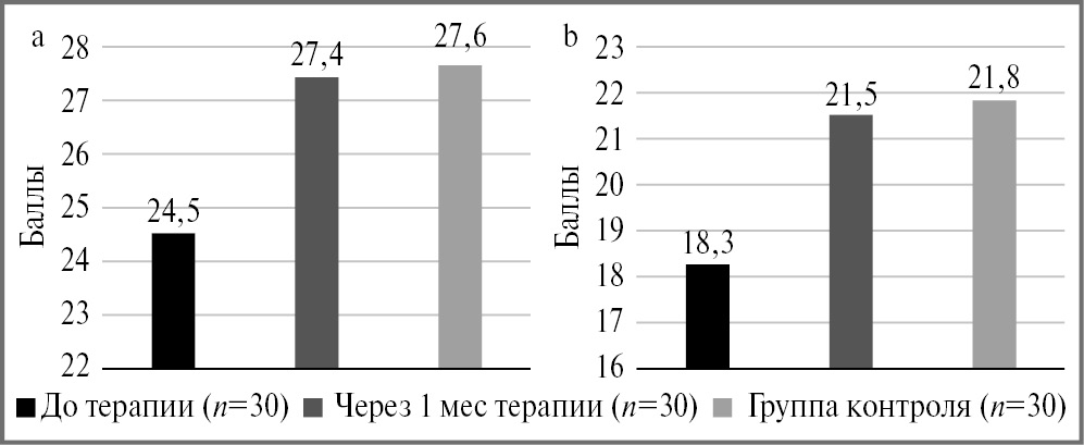 Рис. 4. Результаты статистического исследования средних значений МоСA-теста (a) и теста «Расстановка чисел» (b) – средние значения.