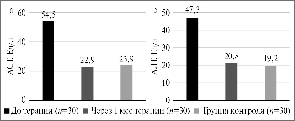 Fig. 5. Statistical data on the levels of aspartate transaminase (a) and alanine transaminase (b) – mean values.