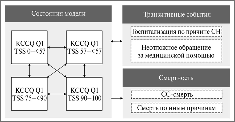 Вероятности переходов между состояниями в модели (квартили KCCQ TSS) получены в результате анализа данных исследований DAPA-HF и DELIVER. Принималась мультиноминальная вероятность переходов, допускалось, что априорное состояние описывается распределением Дирихле, и использовалось семплирование по Гиббсу для получения апостериорного распределения. В модели учитывалось различие скорости течения ХСН в первые 4 мес и последующий период после начала наблюдения в исследовании [11].