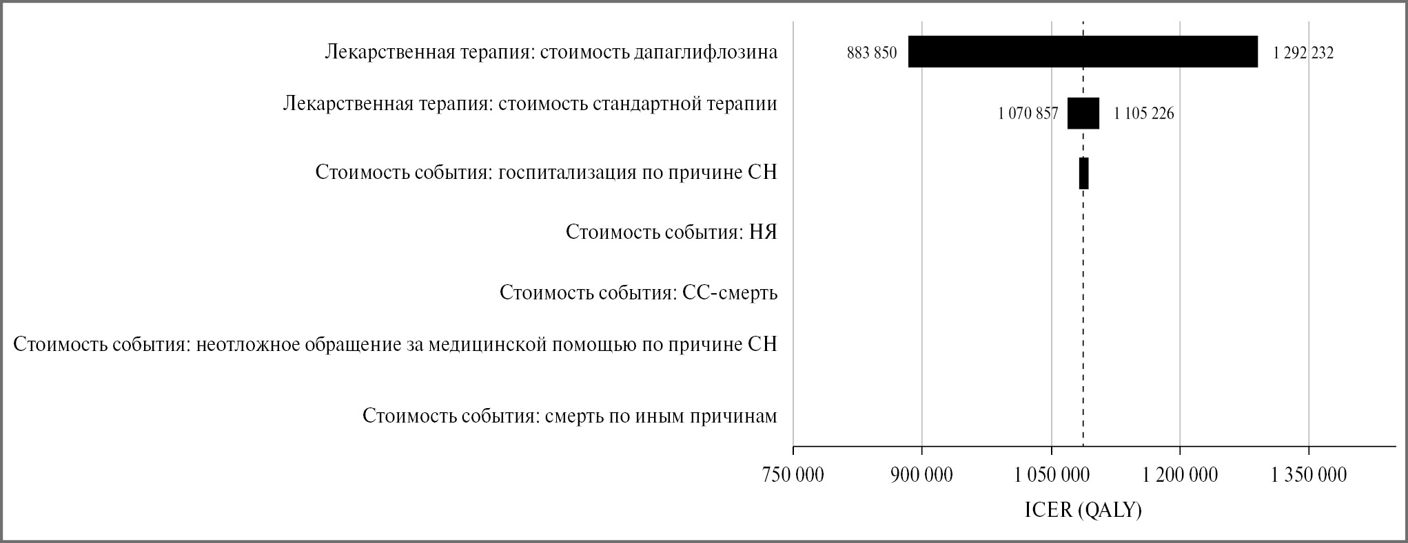 По результатам анализа чувствительности установлено, что наибольшее влияние на результаты оказывает стоимость дапаглифлозина и стандартной терапии ХСН. При этом значения ICER, полученные в анализе чувствительности, не превышали порог готовности платить (рис. 2).