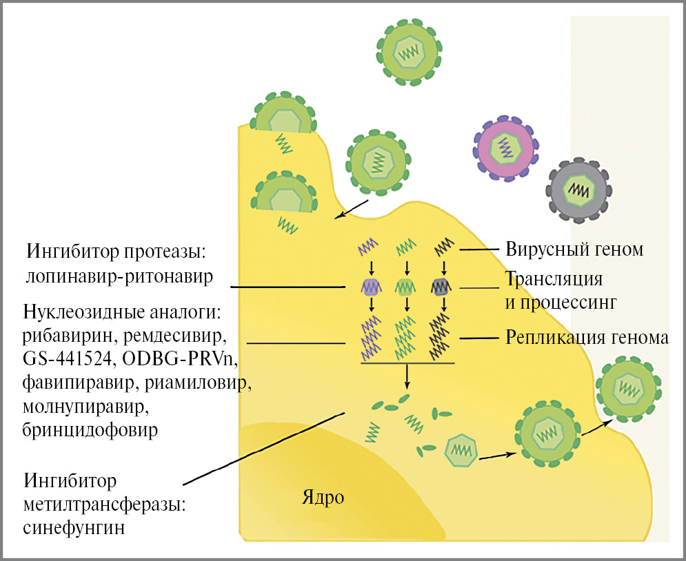 Fig. 1. Representatives of drugs of direct antiviral action and their targets in the cycle of reproduction of the virus.