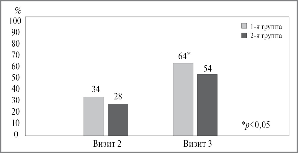 Рис. 1. Доля пациентов с отсутствием на визитах 2 и 3 продуктивного кашля (0–1 балл по шкале тяжести кашля).