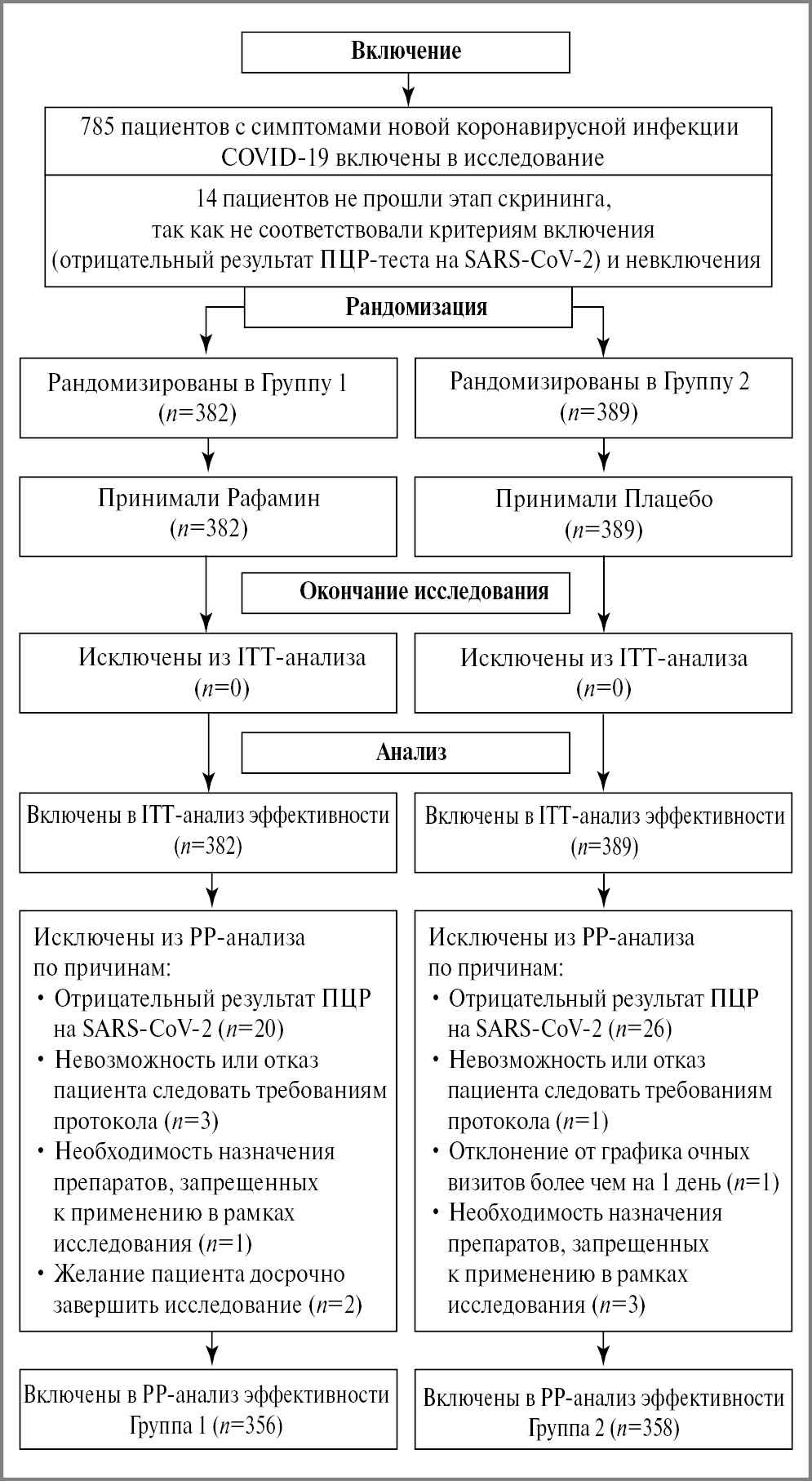 В исследование включили 785 пациентов, из которых 771 участник рандомизирован (14 пациентов не прошли скрининг) в Группу 1 (Рафамин, n=382) и Группу 2 (Плацебо, n=389); рис. 1.