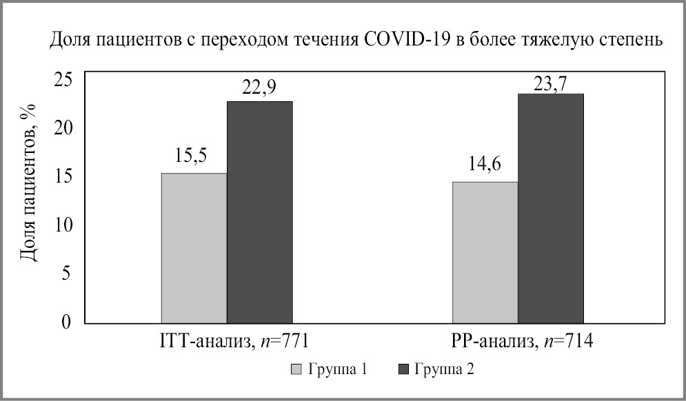 Число случаев перехода течения заболевания в более тяжелую степень для Группы 1 составило 59 (15,5%) [52 (14,6%)] из 382 [356] пациентов, для Группы 2 – 89 (22,9%) [85 (23,7%)] из 389 [358] пациентов (рис. 2).