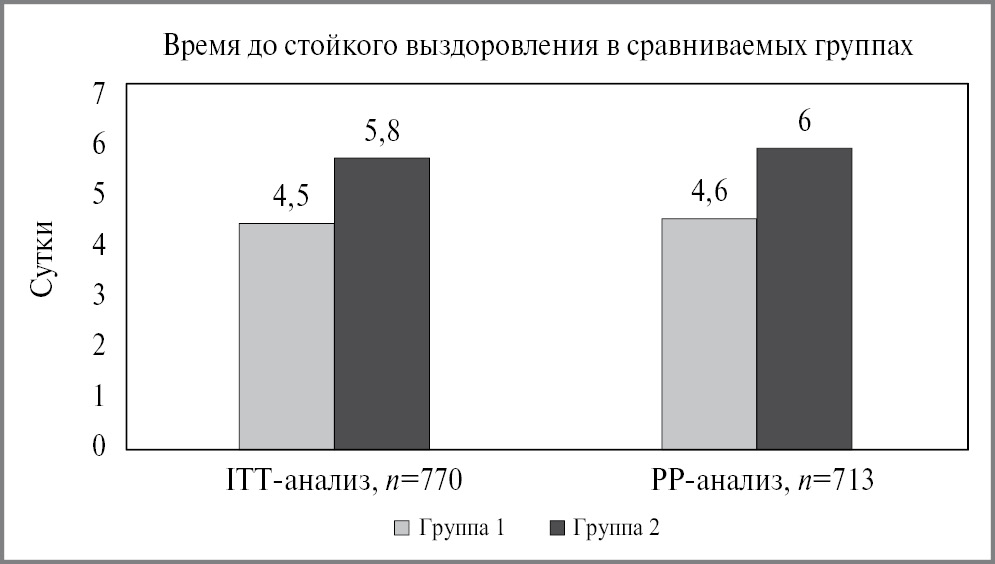 В Группе 1 среднее значение времени до стойкого клинического выздоровления составило 4,5±2,4 [4,6±2,4] сут, что достоверно меньше по сравнению с Группой 2 – 5,8±4,7 [6,0±4,8] сут; p=0,0025 [p=0,0036]. Разница в сроках выздоровления пациентов между группами 1,36±3,74 [1,43±3,81] сут в пользу исследуемого препарата (ИП) (p=0,0025 [p=0,0036] с учетом ошибки первого рода в размере 0,005); рис. 3.