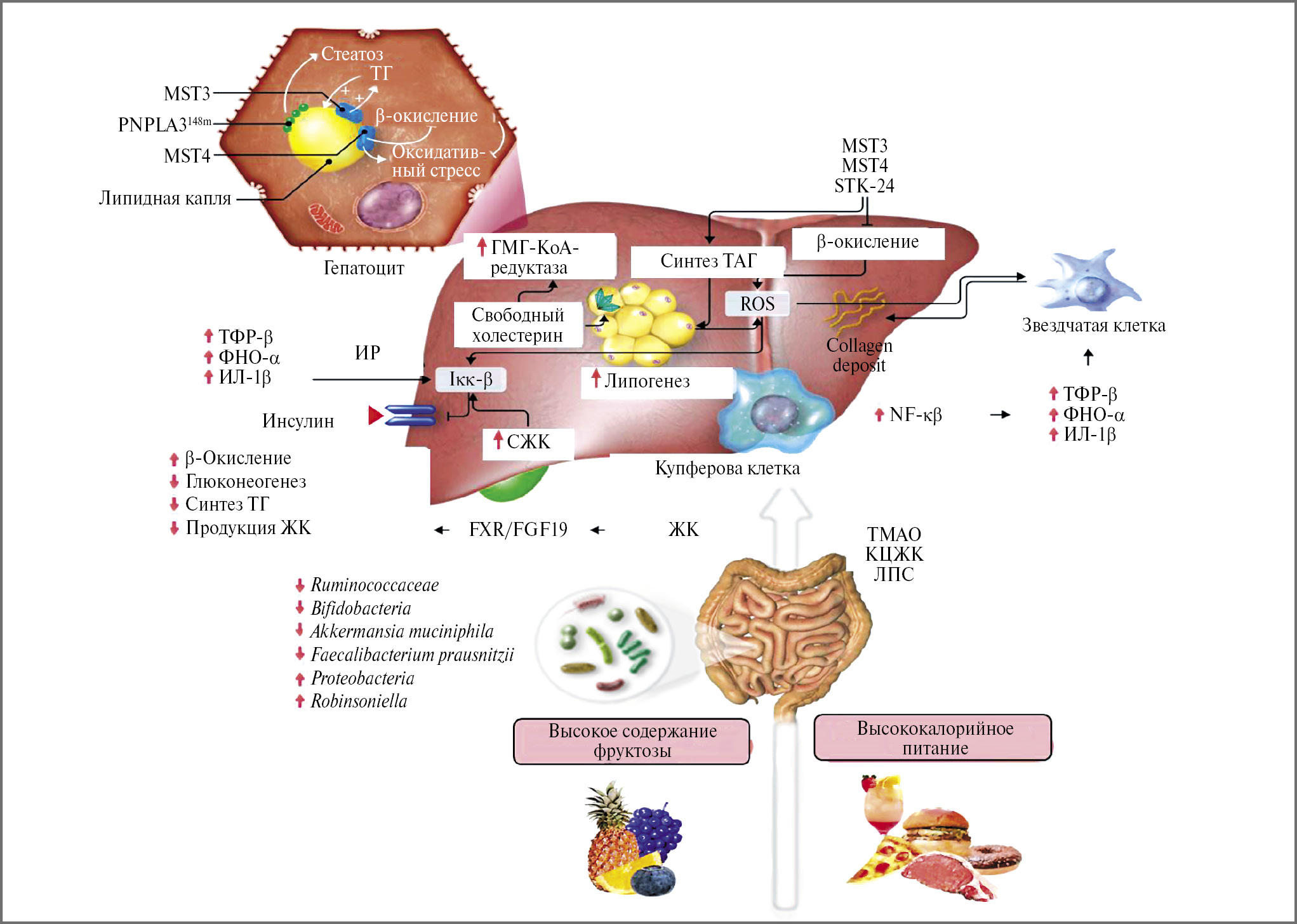 Сложный патогенез поражения печеночной ткани наряду с липотоксичностью и системным воспалением включает инсулинорезистентность (ИР), дисбаланс цитокинов и адипокинов [15, 16], дисбаланс микробиоты с накоплением ее метаболитов, а также повышение проницаемости кишечника с попаданием эндотоксинов (липополисахаридов – ЛПС) в системный кровоток [17–19]. Ключевым морфологическим проявлением НАЖБП является накопление липидных капель в гепатоцитах. Это связано с чрезмерным накоплением свободных жирных кислот (ЖК) в печени, основными источниками которых являются адипоциты жировой ткани, липогенез de novo (конверсия углеводов в жиры в печени) [20, 21]. Токсический эффект избытка свободных ЖК приводит к активации провоспалительных факторов, стрессу эндоплазматического ретикулума, лизосомальной дисфункции, клеточному апоптозу и повреждению печеночных клеток.
