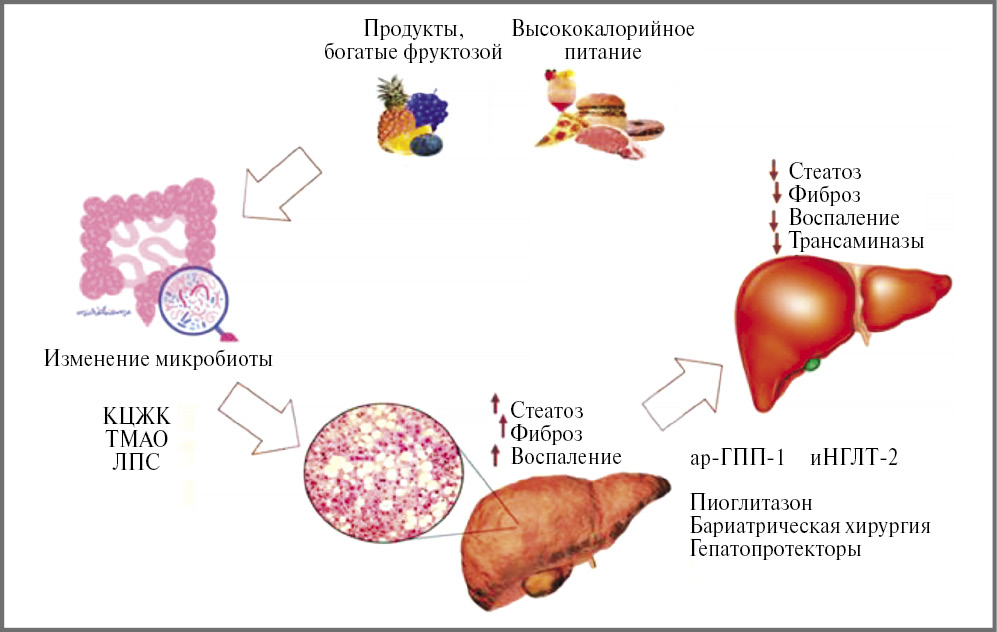Краеугольным камнем в лечении НАЖБП и снижении рисков ассоциированных с ним заболеваний является модификация образа жизни, направленная на снижение массы тела. Однако устойчивая потеря массы тела, несмотря на фундаментальное значение в лечении пациентов с различными метаболическими расстройствами, является сложной задачей, поскольку требует стойкого изменения поведенческих моделей. Как правило, пациентам с НАЖБП рекомендуется сбросить 7–10% массы тела [27]. А при нормальной массе тела должна проводиться коррекция состава рациона, направленная на ограничение или исключение компонентов, способствующих развитию НАЖБП (простые углеводы, готовые блюда быстрого приготовления). Кроме того, отдельное внимание уделяется ограничению употребления алкоголя [27] и продуктов с большим содержанием фруктозы [29], избыточное потребление которой связано с развитием стеатоза печени.