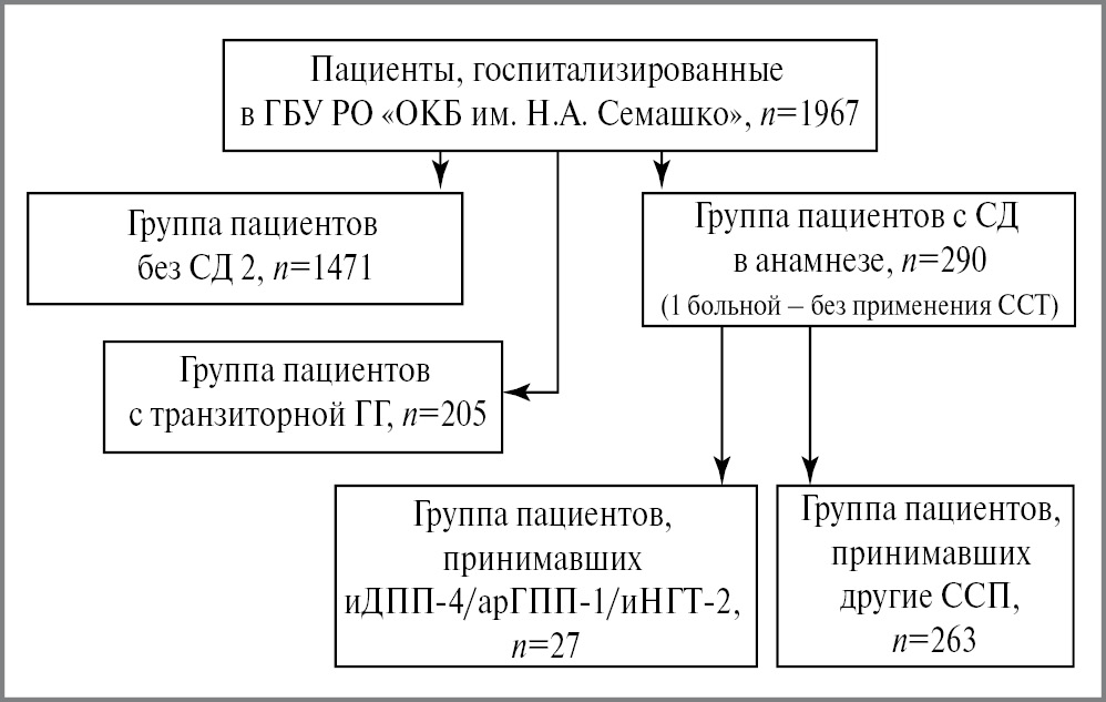 Проведено ретроспективное исследование историй болезни пациентов, госпитализированных в инфекционное отделение ГБУ РО «ОКБ им. Н.А. Семашко» с января по декабрь 2021 г. с диагнозом новой коронавирусной инфекции. Все пациенты соответствовали критериям среднетяжелого, тяжелого или крайне тяжелого течения заболевания. Диагноз COVID-19 у них подтверждался в 1-е сутки госпитализации выявлением в мазках из носоглотки РНК SARS-CoV-2 методом амплификации нуклеиновых кислот (МАНК) в условиях реального времени, согласно действующим временным методическим рекомендациям «Профилактика, диагностика и лечение новой коронавирусной инфекции (COVID-19)». Всего за 2021 г. в ГБУ РО «ОКБ им. Н.А. Семашко» пролечены 1967 пациентов, мужчин – 807 (41 %), женщин – 1160 (59%), средний возраст составил 62 (53–70) года, min – 19, max – 94. Из них умерло 189 (9,6%) человек. Согласно дизайну исследования (рис. 1) для анализа отобрана 291 история болезни пациентов с СД 2, а также 205 историй болезни пациентов со стрессовой ГГ (СГГ), которые, как и пациенты с СД 2, имеют высокие риски неблагоприятного течения при COVID-19 [17]. Средний возраст больных составил 65 (60–72) лет, мin – 22, max – 88. Среди включенных в анализ были 175 (35,2%) мужчин и 321 (64,8%) женщина. В 1-е сутки госпитализации пациентам проводилось комплексное лабораторно-инструментальное обследование для оценки тяжести их состояния. Из сопутствующих заболеваний отмечались атеросклеротические сердечно-сосудистые заболевания, онкологические заболевания в стадии ремиссии, аутоиммунные заболевания без приема сопутствующей иммуносупрессивной терапии. В группе пациентов, имеющих СД 2 до госпитализации, дополнительно выделяли группы больных в зависимости от лекарственных препаратов, используемых для коррекции ГГ. На догоспитальном этапе применялись различные лекарственные препараты и схемы их сочетания. Учитывая хорошие прогностические данные, мы выделили 1-ю группу пациентов, которые на догоспитальном этапе лечились иДПП-4, арГПП-1 и иНГТ-2. Во 2-ю группу вошли пациенты, не принимавшие указанные препараты. Для оценки течения COVID-19 у пациентов в зависимости от эндокринологического анамнеза выбраны наиболее типичные и показательные лабораторные и инструментальные методы оценки: уровень Д-димера, С-реактивного белка (СРБ), ферритина на момент поступления, объем поражения легких по данным компьютерной томографии (КТ), тяжесть течения основного заболевания (интенсивность кислородотерапии), уровень креатинина на момент госпитализации и на 2-й неделе лечения, так как именно в эти сроки чаще всего начинается развитие острого респираторного дистресс-синдрома (ОРДС) и других осложнений инфекции COVID-19 [18]. Анализировался исход основного заболевания. Течение сопутствующих нарушений углеводного обмена оценивали по уровням глюкозы натощак на момент госпитализации и на 2-й неделе лечения, максимальной ГГ за время госпитализации, максимальных доз инсулина, требующихся для коррекции.