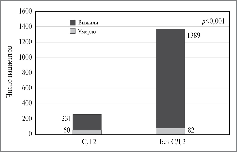 В нашем исследовании пациенты с COVID-19 на фоне СД 2 имели более высокую летальность, чем пациенты без СД, что согласуется с данными другими исследований [1, 2].