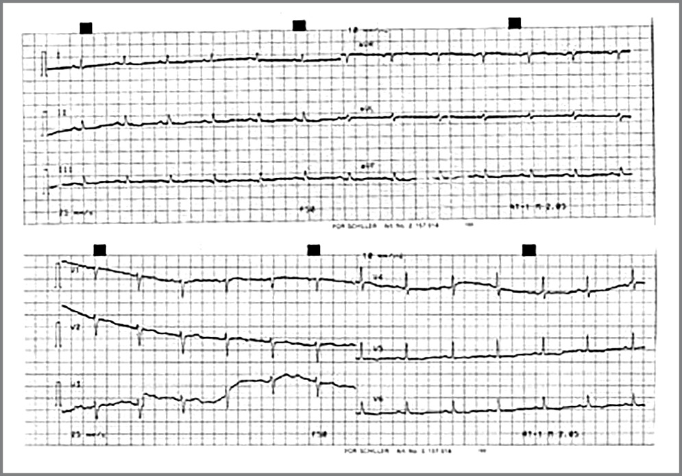 Электрокардиография. Ритм синусовый, частота сердечных сокращений 75 уд/мин, PQ – 0,15 с, QRS – 0,08 с, QT – 0,36 с. Вертикальная электрическая ось сердца (рис. 1).