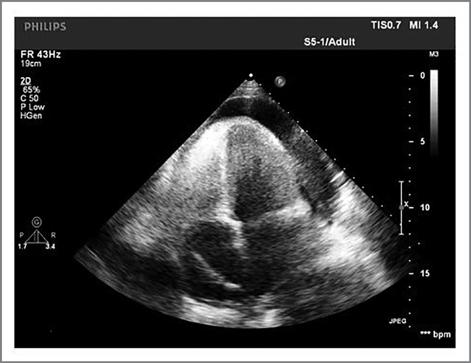 Эхокардиография. Камеры сердца не расширены. Размеры обоих предсердий на верхней границе нормы. Митральная и трикуспидальная регургитация до 1-й степени. Глобальная и локальная сократимость левого желудочка не нарушена. Диастолическая дисфункция левого желудочка. Признаки умеренной легочной гипертензии. Большое количество жидкости в полости перикарда с признаками сдавления сердца (тампонада); рис. 2.