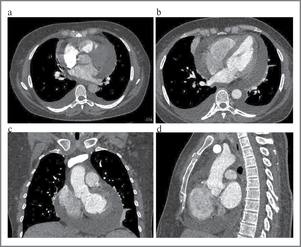 Рис. 4. Компьютерная томограмма сердца больной К.: a, b – аксиальная проекция; c – корональная проекция; d – сагиттальная проекция.