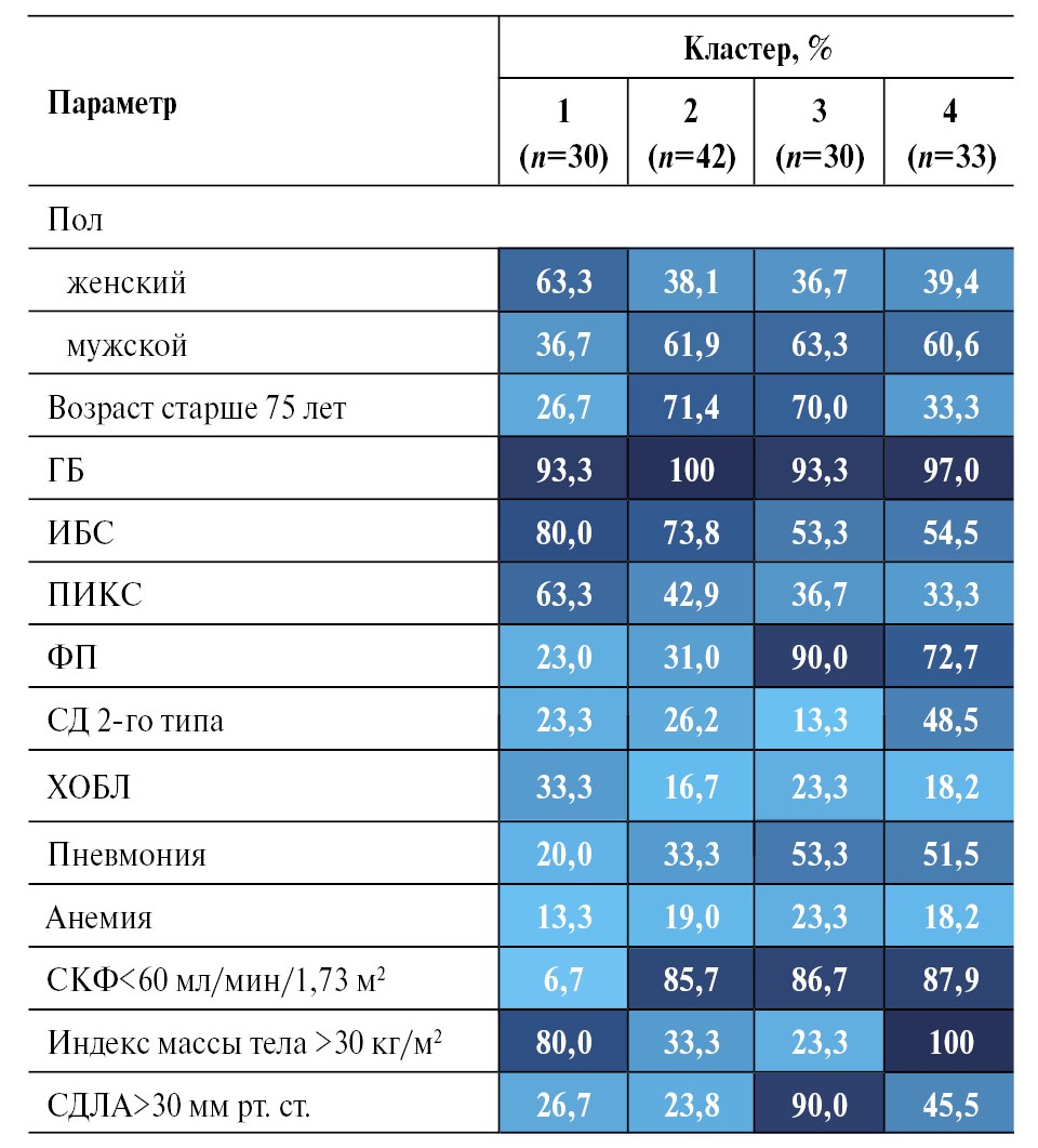 В нашем исследовании в результате кластеризации выделено 4 кластера, сопоставимых по числу пациентов, но весьма неоднородных по полу, возрасту и коморбидной патологии (рис. 5).