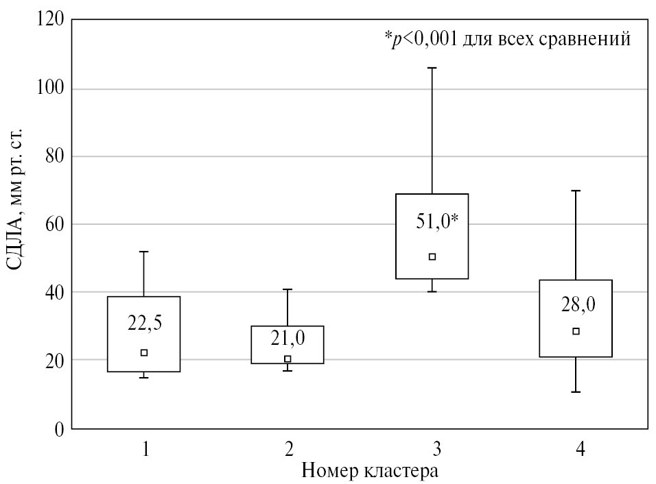 Рис. 2. Показатели СДЛА в кластерах пациентов. При сравнении групп использовали критерий Краскела–Уоллиса.