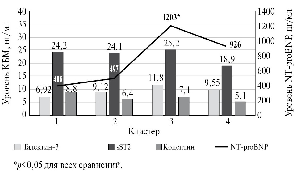 Fig. 3. Сardiac biomarkers in the clusters. Тhe main axis (bar graphs) shows levels of galectin-3, sST2, copeptin (ng/ml). The extra axis (line graph) shows NT-proBNP levels (pg/ml).