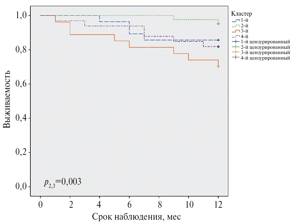 Статистическую обработку результатов проводили в программах Statistica 12.0, Jamovi 3.2.2. При статистической обработке данных для количественных переменных с нормальным распределением рассчитывали среднее арифметическое (М) ± стандартное отклонение (σ); для переменных с ненормальным распределением – медиану, 25-й и 75-й перцентили – Ме [Q25; Q75]. Достоверность различий средних значений оценивали с помощью: t-критерия Стьюдента (p – при нормальном распределении) и U-критерия Манна–Уитни (p – для переменных с ненормальным распределением). При сравнении частотных показателей для оценки достоверности использовали критерий χ2 по Пирсону. Для выявления статистически значимых различий между группами применен критерий Краскела–Уоллиса (one-way ANOVA) с последующим анализом парных различий. Статистически значимым для всех используемых параметров принималось значение менее 0,05. Кластерный анализ выполнен на языке программирования Python версии 3.11, с использованием библиотек Pandas, Numpy и Scikit-learn. Для кластерного анализа использовался алгоритм k-средних, оценку качества разделения кластеров проводили на основании значения силуэтной меры связывания, равного 0,02. Оценку выживаемости проводили через 12 мес после включения пациента в исследование. Для анализа 12-месячной выживаемости применен метод Каплана–Мейера, для сравнения кривых использовали log-rank test.