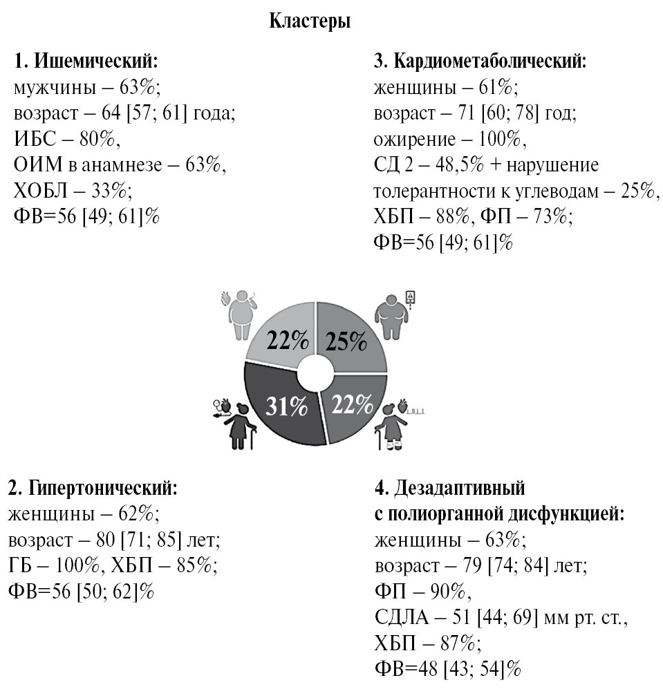В 1-м кластере (n=30, 22%) преобладали относительно молодые пациенты мужского пола, в возрасте 64,0 [57, 5; 76, 3] года с сохраненной ФВ ЛЖ (56 [49; 61]%), страдающие ГБ (93%) и ИБС (90%), в том числе с перенесенным ОИМ в анамнезе (57%), что позволило обозначить данный фенотип как ишемический. Среди некардиальных коморбидных заболеваний в этом кластере отмечен высокий процент хронической обструктивной болезни легких (ХОБЛ) (33%), что соответствует высокой частоте позитивного статуса курения.