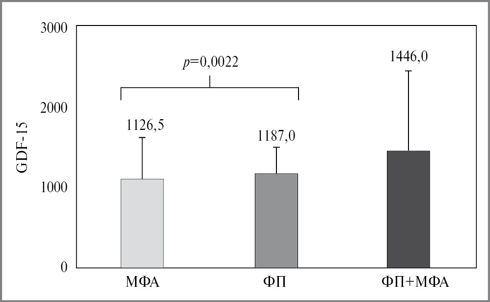 При анализе всех включенных больных медиана уровня GDF-15 составила 1185,0 пг/мл [850, 0; 1680, 0]. Мы сочли разумным осуществить поиск клинических показателей, связанных с повышением GDF-15. Как показано на рис. 1, уровень GDF-15 не различался в подгруппах больных, имевших только ФП или МФА. У пациентов с ФП и сопутствующим МФА уровень был достоверно выше (p=0,0022), чем у первых 2 категорий больных: медиана 1446,0 пг/мл против 1187 пг/мл и 1126,5 пг/мл соответственно.
