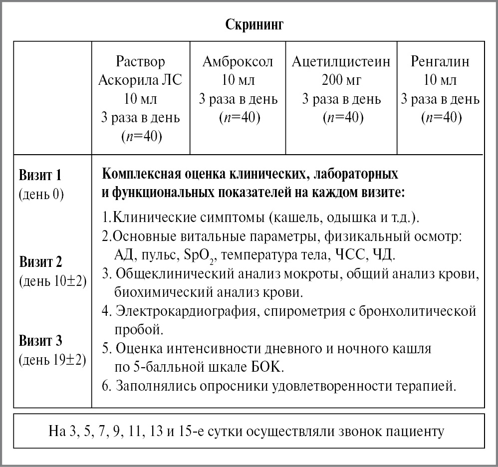 В исследование включены 160 пациентов согласно критериям включения, невключения и рандомизированы на 4 группы лечения. Пациентам каждой группы назначена терапия согласно рандомизации: 1-я группа – 10 мл исследуемого препарата, 2, 3, 4-я – монокомпонентная терапия препаратами сравнения (амброксол, ацетилцистеин, Ренгалин) 3 раза в день в течение 20 дней. В период скрининга пациентам выполняли рентгенографию грудной клетки. Электрокардиографию в 12 отведениях, клинико-лабораторное и физикальное обследования, включая аускультацию легких, и измерение жизненно важных показателей проводили на каждом визите. В течение 20-дневного периода лечения пациенты принимали 3 раза в день по 10 мл исследуемого препарата (амброксола гидрохлорида – 30 мг, гвайфенезина – 100 мг, левосальбутамола сульфата, эквивалентного левосальбутамолу, – 1 мг) или препараты сравнения (амброксол, Ренгалин, ацетилцистеин). Терапию сравнения (монокомпоненты) пациентам назначали без названия фирм-производителей, указывали только действующее вещество, дозу и кратность приема препарата. Пациенты каждой группы получали лечение согласно рандомизации. Контроль нежелательных явлений (НЯ) и сопутствующей терапии проводился на каждом визите.