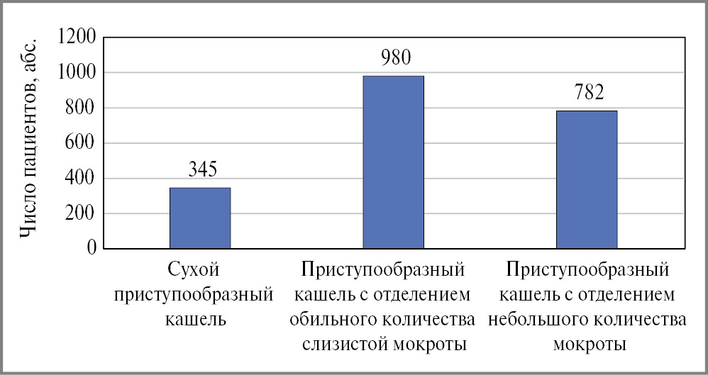 Методом случайной выборки с приема пульмонолога УНИИФ (август–декабрь 2023 г.) отобраны пациенты с ОРВИ и ОБ. Независимой руппой наблюдения проанализированы симптомы, послужившие поводом для обращения за медицинской помощью. Выявлена следующая закономерность: самой часто встречающейся проблемой послужило развитие приступообразного кашля в любое время суток с отделением мокроты. Анализ проводили по данным амбулаторных карт пациентов (n=2107). Из данной выборки в дальнейший анализ включили 160 пациентов. Характер кашля пациентов с ОРВИ и ОБ отражен на рис. 2.