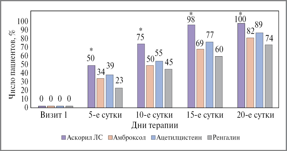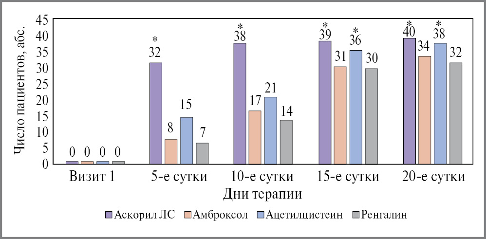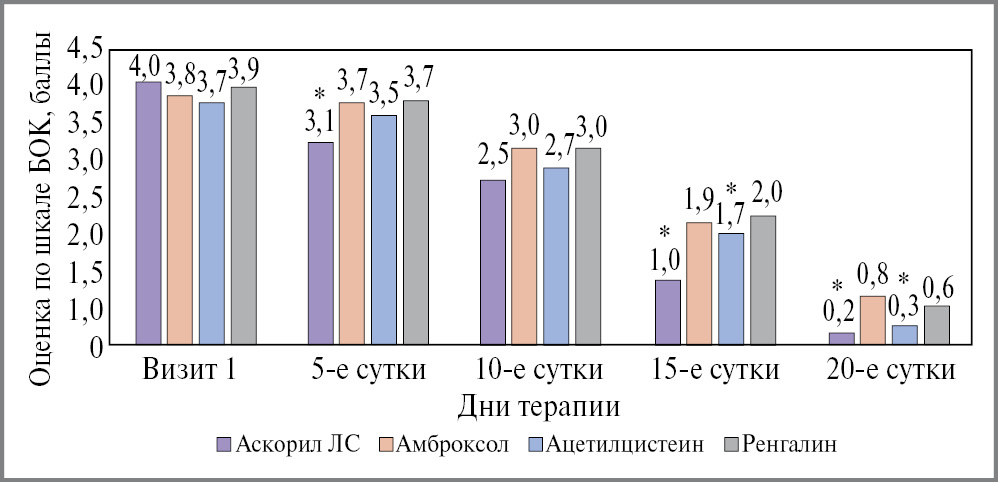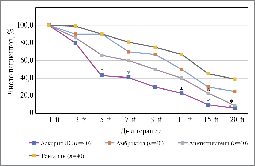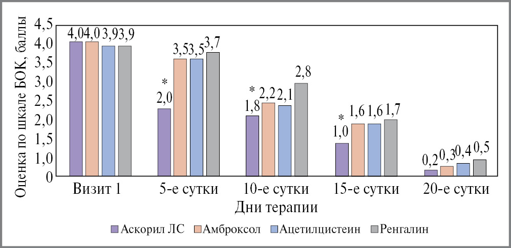 Выраженное клиническое улучшение в виде значительного регресса кашля отмечено в 80% случаев (32 пациента) в группе пациентов, принимающих Аскорил ЛС, на 5-е сутки, что достоверно больше по сравнению с другими группами лечения. Данная тенденция сохраняется и на 10-е сутки лечения. На 15-е сутки клиническое улучшение наступило у 97,5% пациентов группы принимающих Аскорил ЛС, в группе пациентов, принимающих амброксол, – 77,5%, ацетилцистеин – 90%, Ренгалин – 75%. Достоверная разница выявлена в группе пациентов, принимающих Аскорил ЛС, начиная с 5-х суток наблюдения, и в группе, принимающей ацетилцистеин, на 15 и 20-е сутки. Данная закономерность между группами лечения появилась и сохранялась только в группе пациентов, принимающих Аскорил ЛС, на 5 и 10-е сутки терапии. Пациентов, получающих лечение новой комбинацией, содержащей амброксол, гвайфенезин и левосальбутамол, на 5-й день терапии достоверно меньше беспокоил ПК по сравнению с пациентами других групп.