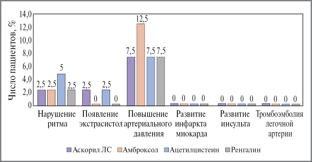 С учетом проведения исследования в реальной клинической практике и наличия сопутствующей патологии у пациентов всех групп лечения, в том числе и сердечно-сосудистой, оценка безопасности являлась первичной конечной точкой протокола исследования. Всего за период наблюдения зарегистрировано развитие НЯ у 21 (13,1%) пациента во всех группах, в группе исследуемого препарата – у 2 (5%) пациентов. Наиболее частыми НЯ были головная боль (10% в группах монотерапии vs 2,5% в группе Аскорила ЛС), першение в горле (3,3% vs 2,5%), головокружение (2,5% – только в группах приема Ренгалина и ацетилцистеина), тошнота (0,8% – только в группе ацетилцистеина). Ни одно из НЯ не удовлетворяло критериям серьезности и не привело к досрочному выбыванию пациентов из исследования. Достоверной разницы в развитии сердечно-сосудистых событий в группах лечения не зарегистрировано, что показано на рис. 8.
