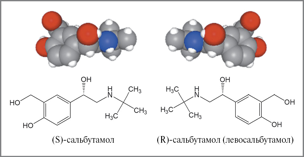 Сальбутамол представляет собой хиральную молекулу, т.е. существует в виде двух энантиомеров: R- и S-изомера, которые являются зеркальными отражениями друг друга (рис. 1). Как и большинство хиральных фармацевтических веществ [6], сальбутамол используется в виде рацемической смеси (соотношение R- и S-изомеров 1:1), хотя β2-агонистическая активность присуща практически только R-энантиомеру. Так, исследования in vitro показали, что у (R)-сальбутамола (левосальбутамола) аффинность к β2АР примерно в 2 раза выше по сравнению с рацемическим сальбутамолом и в 100 раз выше, чем у (S)-сальбутамола [7, 8]. Энантиоселективность сальбутамола и накопление данных о возможных неблагоприятных эффектах (S)-сальбутамола привели к разработке препарата энантиомерно чистого (R)-сальбутамола, известного как левосальбутамол3 (левальбутерол).