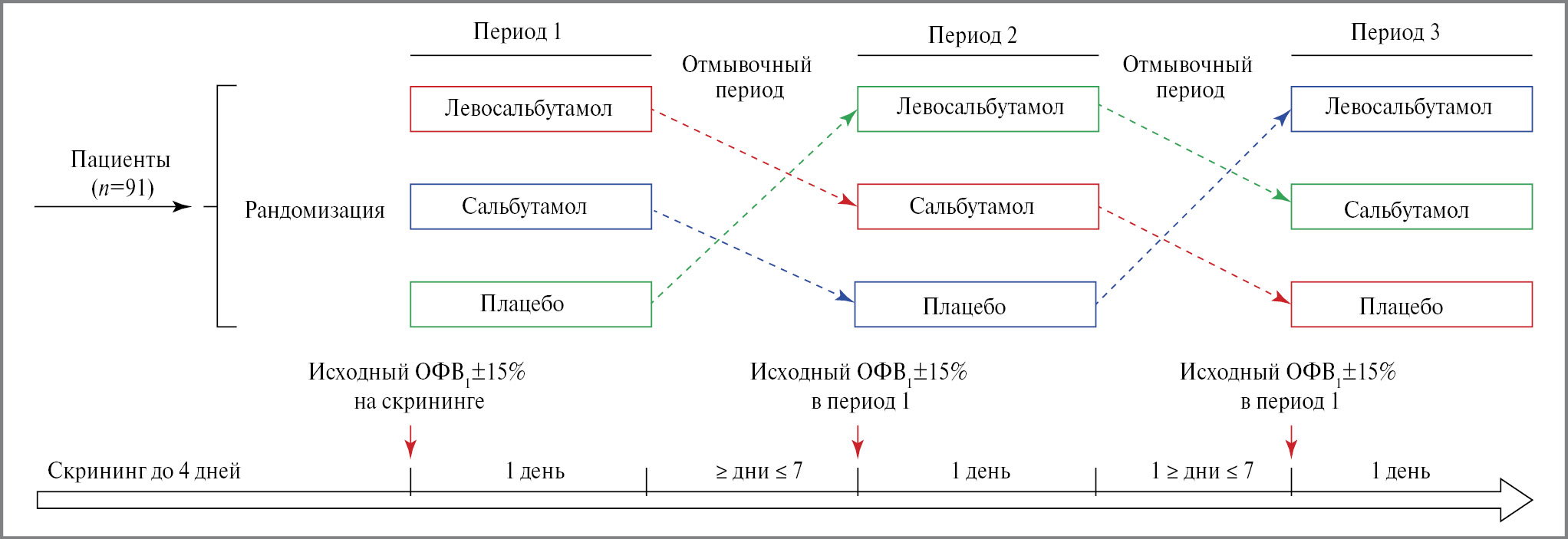 Исследование включало период скрининга длительностью не более 4 дней и 3 периода лечения (периоды 1–3). Каждый период лечения длился 1 день, отмывочный период – не менее 1 дня (т.е. не менее 24 ч, но не более 7 дней) рис. 2. Пациентам, которые на визитах лечения не соответствовали критериям в отношении исходного ОФВ1 (в пределах ±15%), дозирование препарата не проводилось и их визит переносился на другой день в пределах 7 дней.