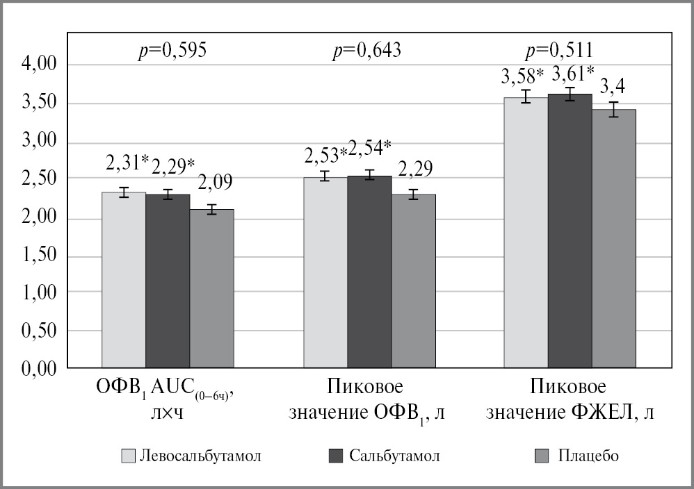 Рис. 3. Анализ скорректированных по исходному уровню ОФВ1 AUC(0–6ч) после введения препаратов исследования, пиковых значений ОФВ1 и ФЖЕЛ. Популяция mITT. Представлены среднеквадратичные значения (± ошибка среднего); *p<0,001 по сравнению с группой плацебо; указаны р-значения для группы левосальбутамола по сравнению с группой сальбутамола.