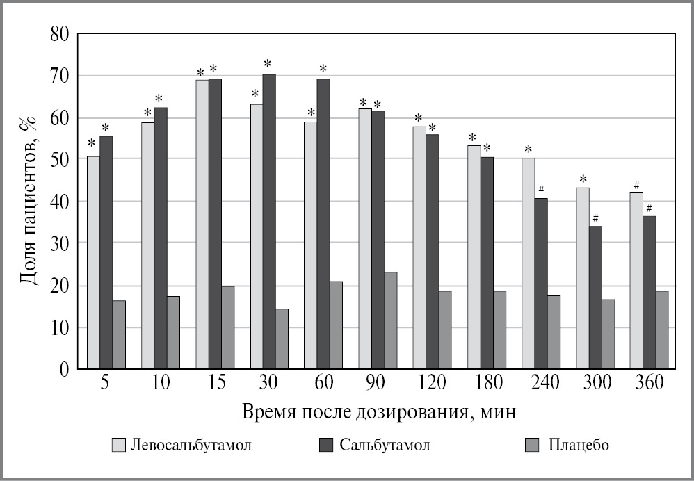 Доля пациентов с приростом ОФВ1 на ≥12% относительно исходного уровня через 5 мин после дозирования 90 мг левосальбутамола составила 50,9%, 180 мг сальбутамола – 55,8% и плацебо – 16,3% (рис. 4).