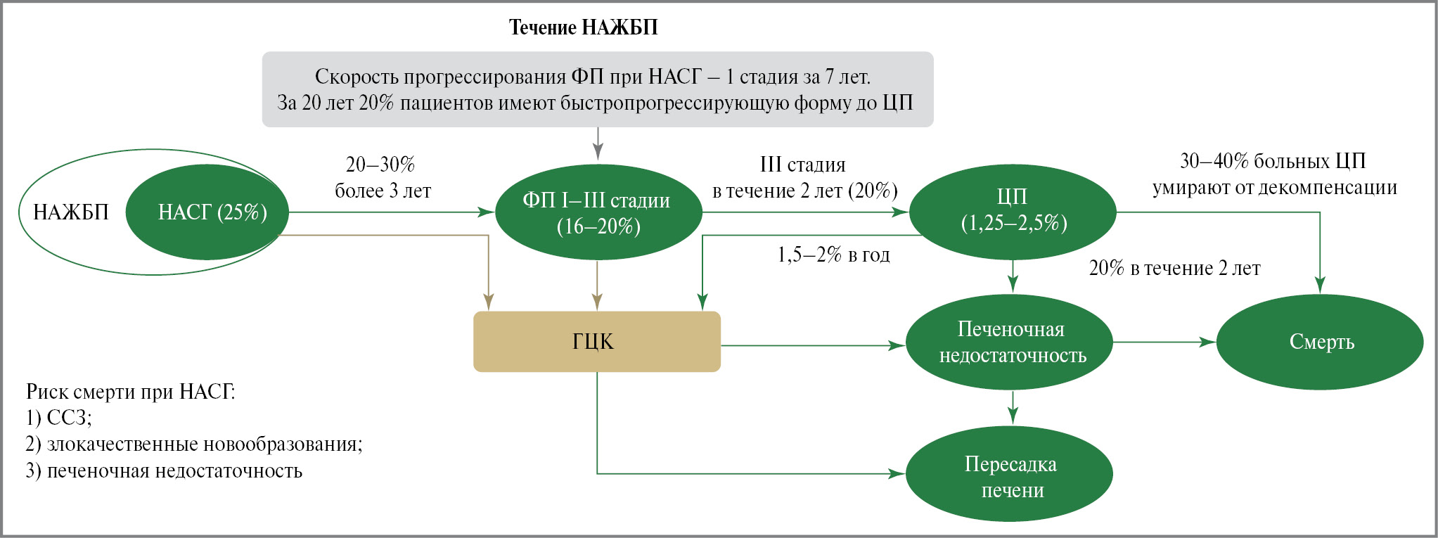 Доклад, посвященный обновленной номенклатуре НАЖБП, представлен профессором И.Г. Бакулиным, который обобщил эволюцию взглядов на проблему НАЖБП и подходов к определению заболевания. Так, термин НАЖБП впервые использован в 1985 г. Под морфологической основой НАЖБП ранее представляли безобидную инволюцию гепатоцитов, в связи с чем исторически сложилось, что НАЖБП считалась диагнозом исключения. Исходно полагали, что НАЖБП протекает линейно и выделяли следующие стадии заболевания: СП, стеатогепатит (СГ), фиброз печени (ФП), ЦП, рак печени. Клиническое значение придавалось лишь СГ и ФП [22], а также эффективности терапии, направленной на регресс СГ и ФП [23, 24]. Однако в дальнейшем выявлена связь между прогрессированием НАЖБП и кардиометаболическими рисками, а также возможность нелинейного течения НАЖБП (повышение риска ГЦК уже со стадии СП). Варианты течения НАЖБП представлены на рис. 1.