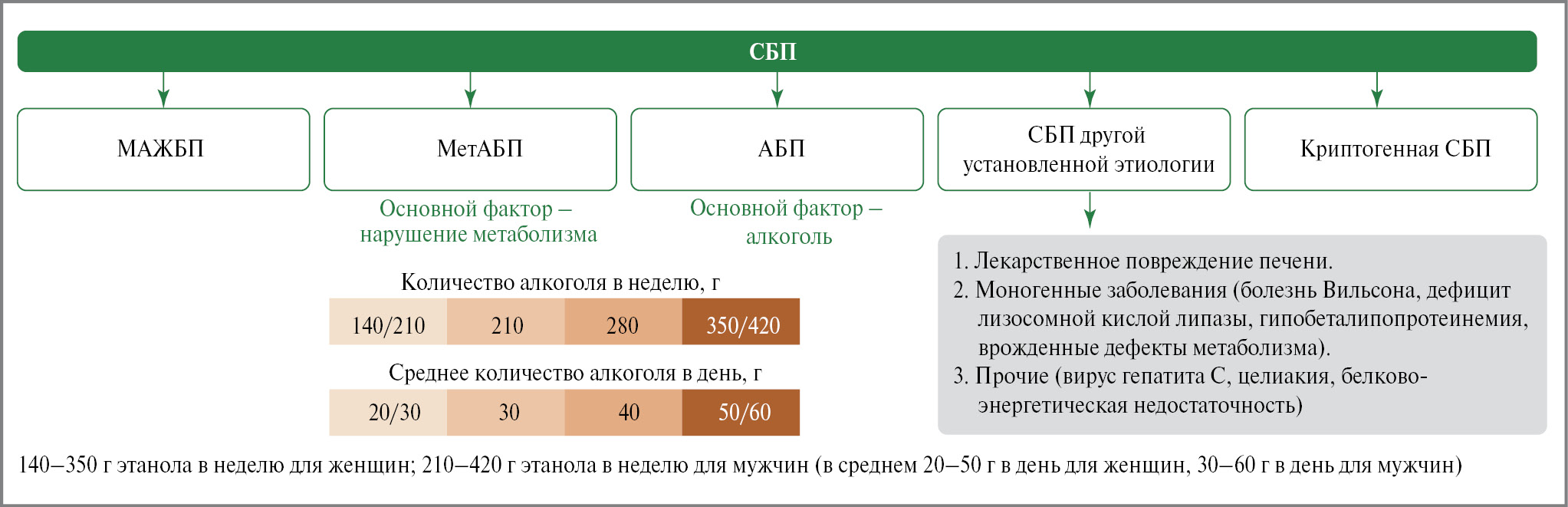 В 2023 г. опубликовано консенсусное заявление по изменению номенклатуры НАЖБП [27]. Для СП любой этиологии предложено использовать зонтичный термин «стеатозная» (или «жировая») болезнь печени (СБП), которая подразделяется на 5 групп: